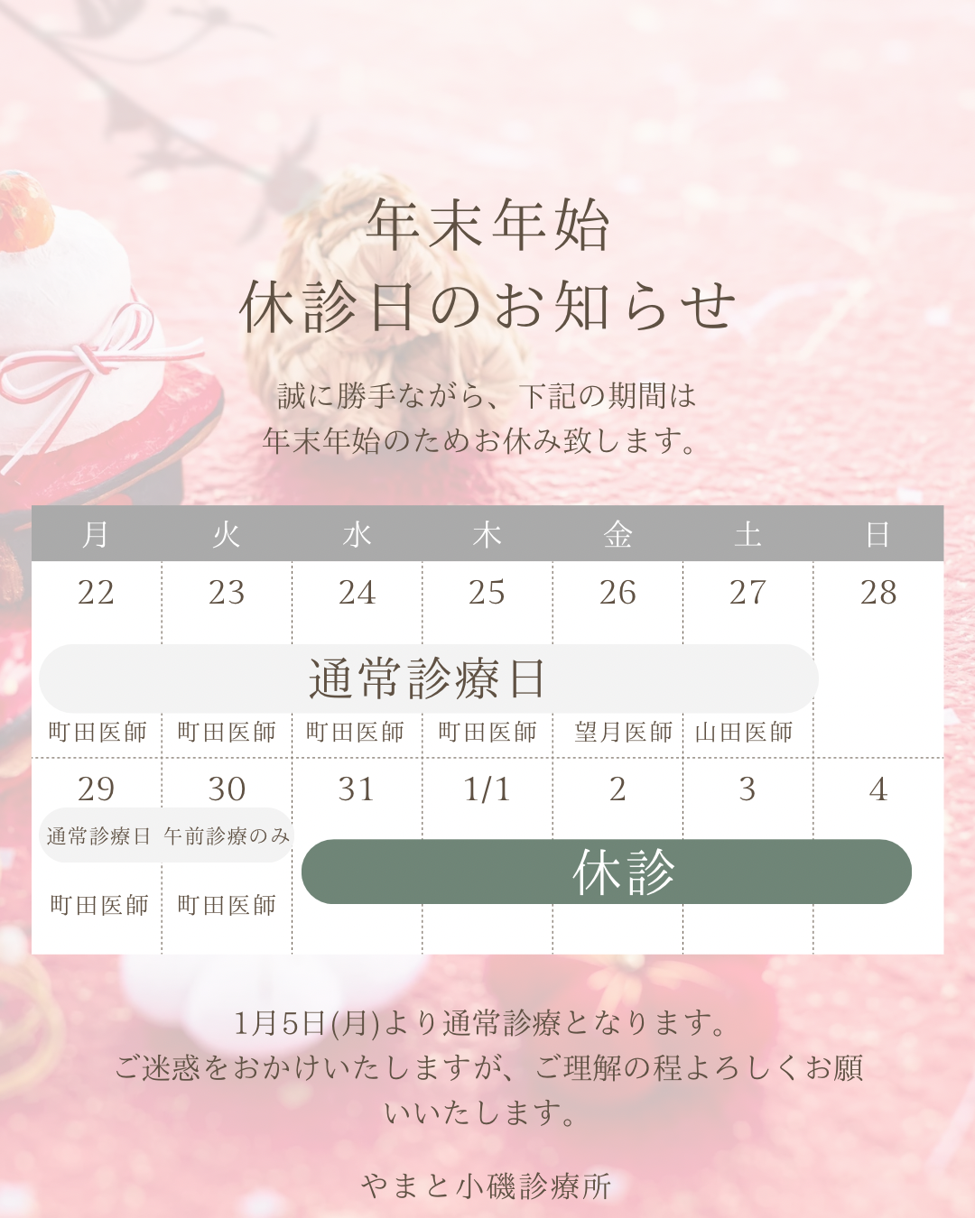 当院は以下の期間、年末年始休暇のため休診とさせていただきます。